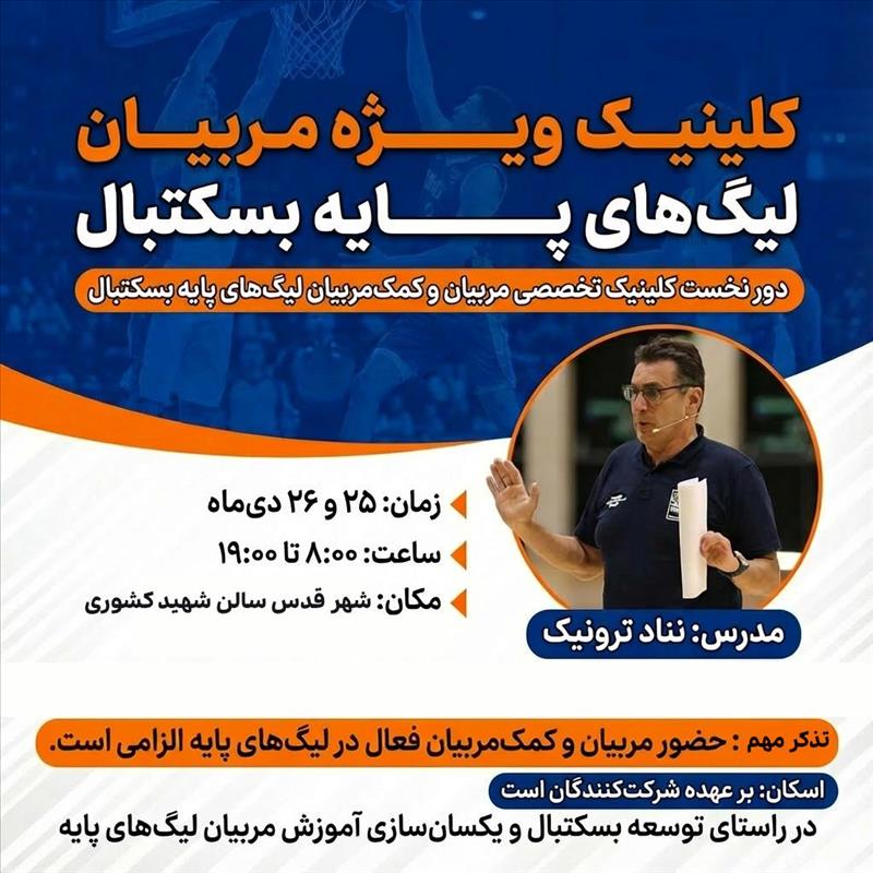 دور اول کلینیک تخصصی مربیان لیگهای پایه بسکتبال، با تدریس نناد ترونیک و به میزبانی تهران برگزار میشود.