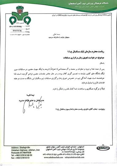به گزارش روابط عمومی فدراسیون بسکتبال، نیما نکیسا، مدیرعامل باشگاه ذوب آهن اصفهان طی نامهای درخواست بازگشت به لیگ برتر را کرد.